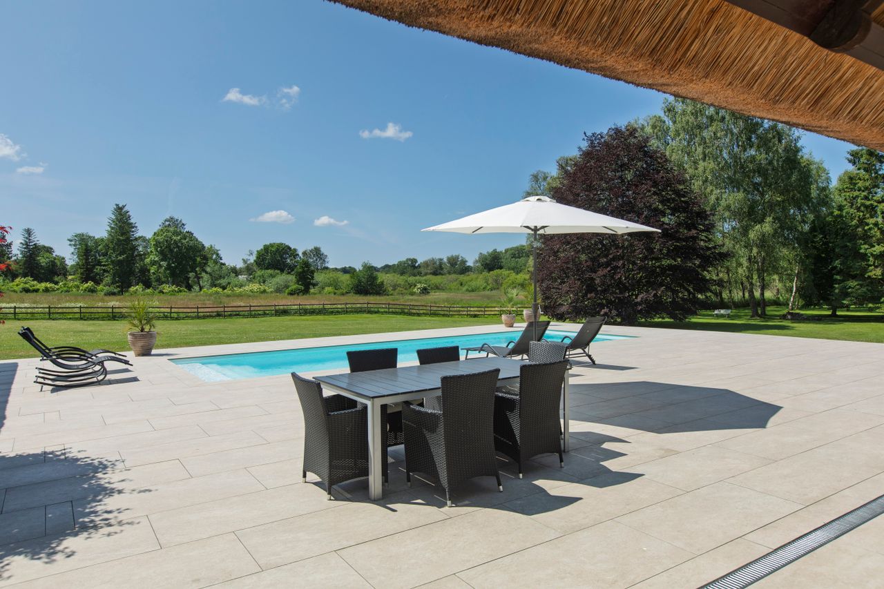 Et særligt blikfang er den store, eksklusive terrasse i niveau med huset. Den er hævet over det øvrige terræn, hvilket giver både optimal udsigt og sol. I terrassen er der indbygget en opvarmet swimmingpool med elektrisk overdækning. Poolområdet emmer af sydlandsk stemning og luksus, fra de store italienske keramiske fliser, og er ideelt til både afslapning og socialt samvær. Poolen er fra Berle.