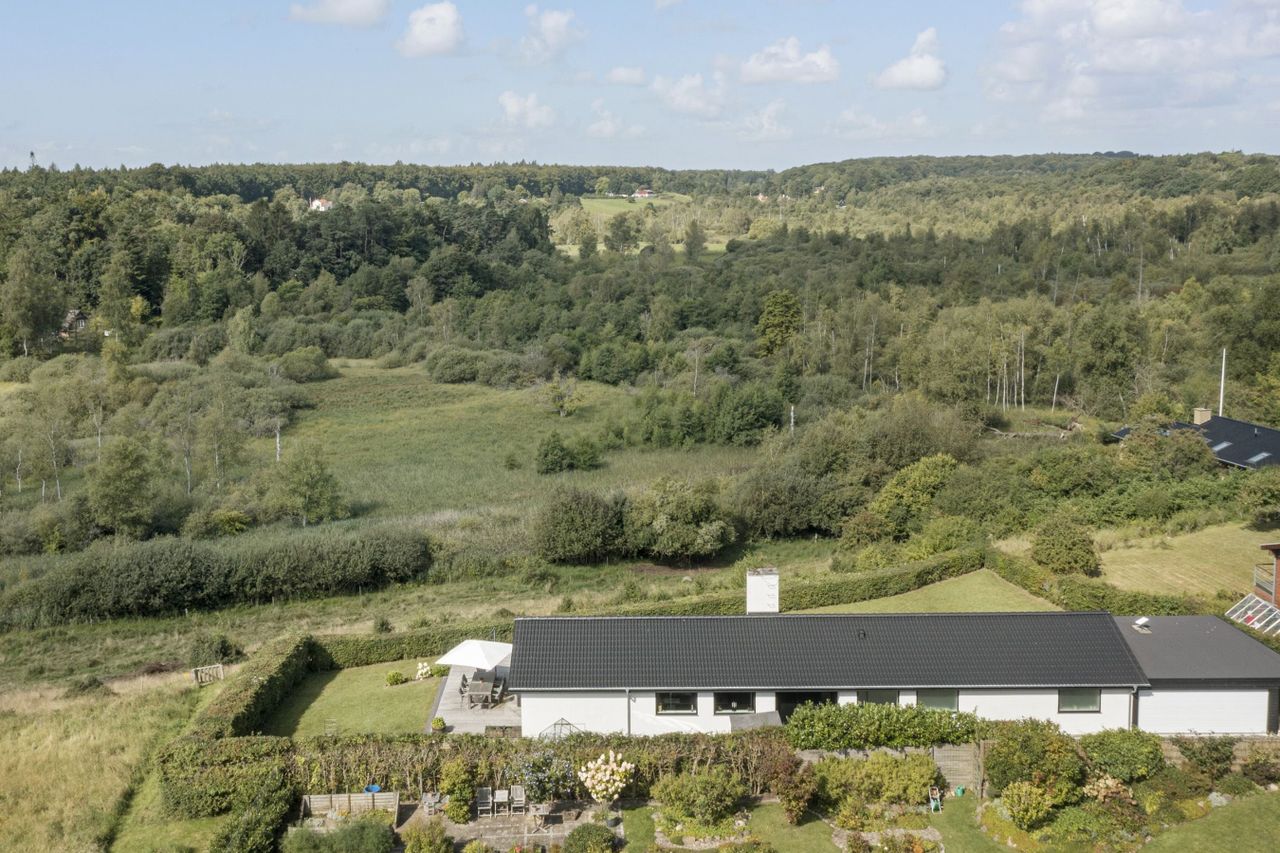 ligger meget privat og fuldkommen uforstyrret for enden af en lukket villavej. Med høj og smuk udsigt over