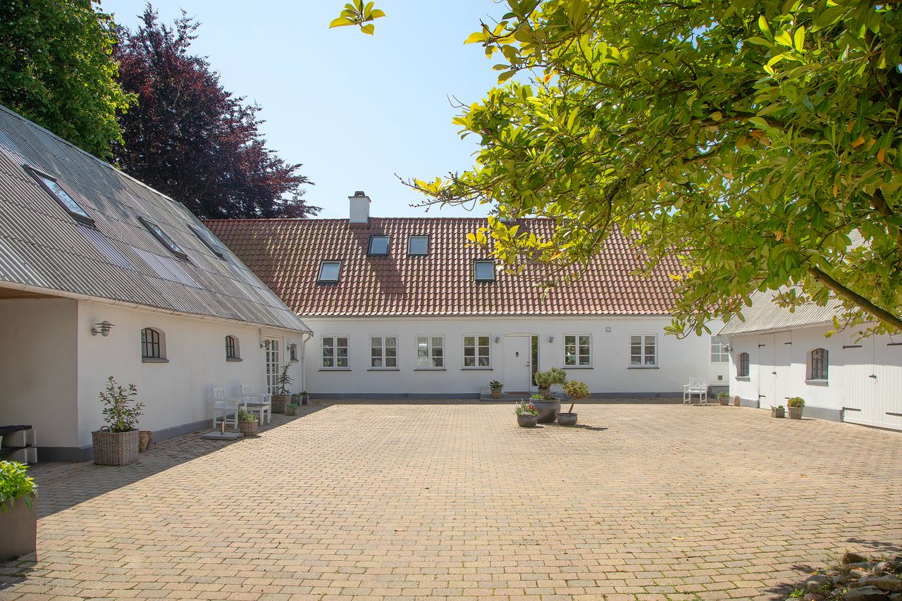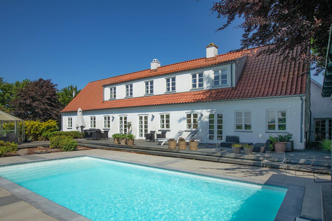 Stuehusets terrasse/poolmiljø og have er orienteret mod syd/vest med hyggelige spisepladser, pergola, en dejlig sø m.v. Her skråner arealet let nedad, så udsigten til de omkringliggende marker kommer helt til sin ret. Her er meget smukt - nærmest meditativt. Planløsningen er moderne og tidssvarende med flere store rum, to stuer en-suite, flere gode værelser, moderne køkken og badeværelser, fritlagte hanebånd på 1. sal samt flotte egetræsplankegulve mv. Grundet stuehusets høje placering er der et meget smukt og naturligt lysindfald i størstedelen af rummene.