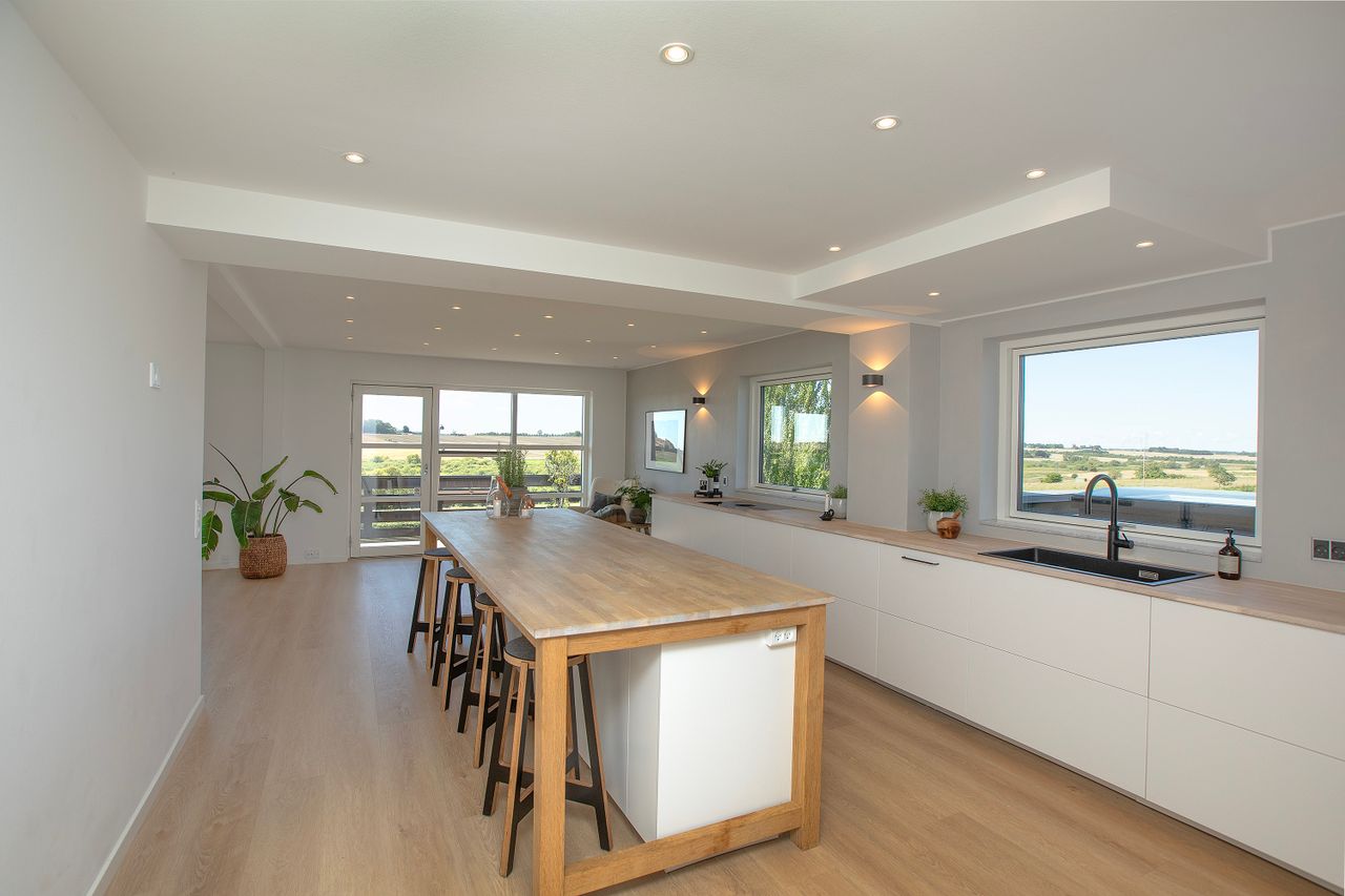 b: Huset er lige sat i stand, der er væltet vægge og det hele er helt nytænkt indvendig, så den fremtræder ualmindelig lækker, nutidig og indbydende - og med en virkelig god planløsning. Her er lyst dejligt køkken fra 2023-24, som hænger sammen med spisestuen, stuen og havestuen - og skaber et eksklusivt, hyggeligt åbent hjem med masser af lys, luft og plads. Flere udgange til både terrassen og til balkonen, som ligger ideelt for både sol og udsigt. Man er helt privat, for huset ligger højt.