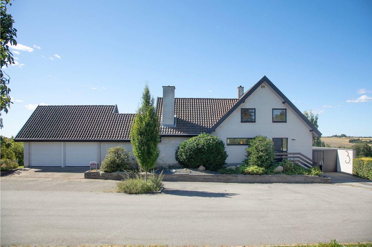 a: Den ligger helt optimalt. Højt hævet, så udsigten er uforstyrret og vidunderlig - i første række til ådalen i det sydlige Ringsted. Og så tæt på centrum at man kan gå og cykle til både indkøb, skole m.v. Fra alle husets tre niveauer er der adgang ud til terrasser / balkon m.v. og her er fuld udsigt og masser af dejligt lysindfald i huset. Grunden er 995 m2.