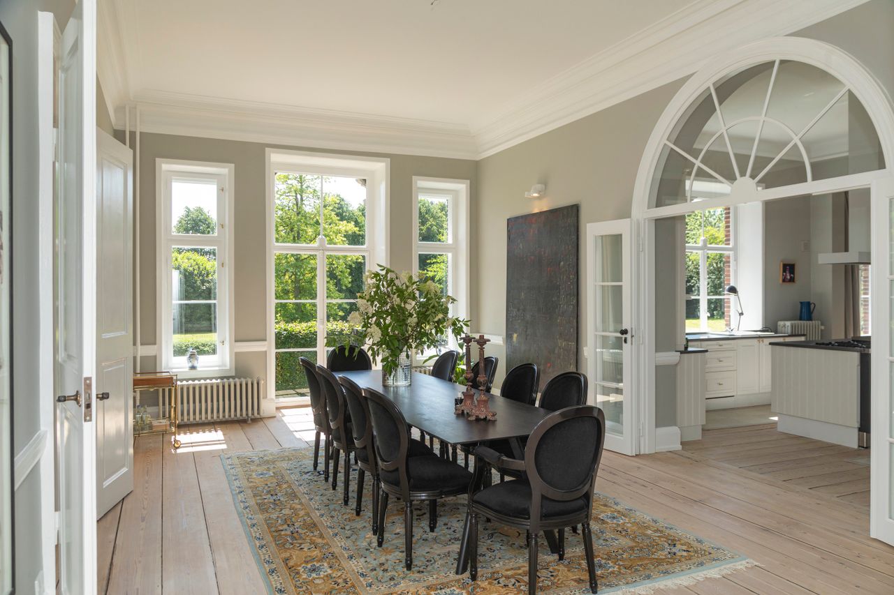 Både udvendigt og indvendigt betages man af husets æstetik. Det er lykkedes de nuværende ejere at modernisere med stor sikkerhed, så det klassiske og det nutidige mødes i harmonisk balance. Væggene er smagfuldt afstemt i grå nuancer, kontrasteret af hvide paneler og detaljer, der understreger rummenes fine proportioner.