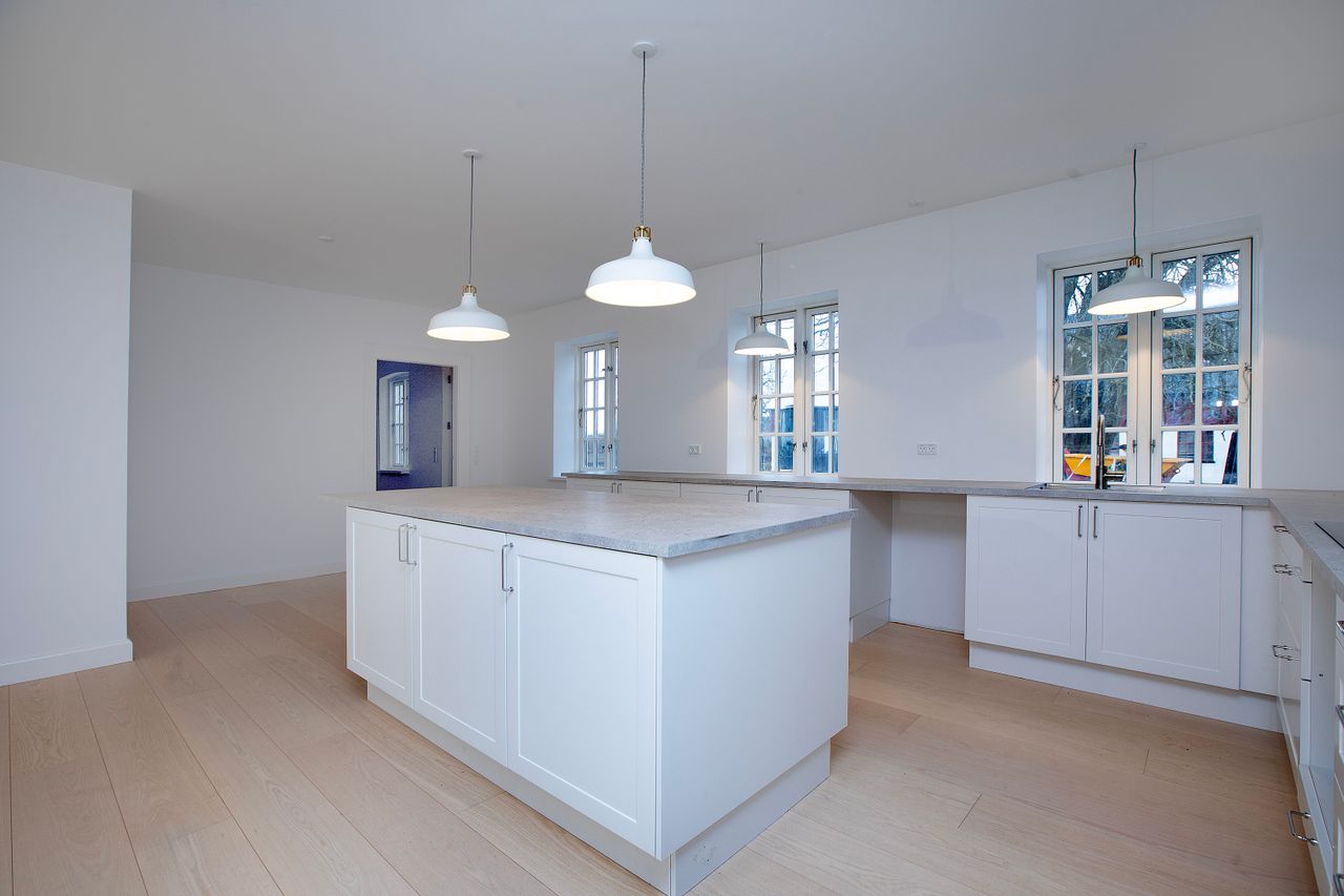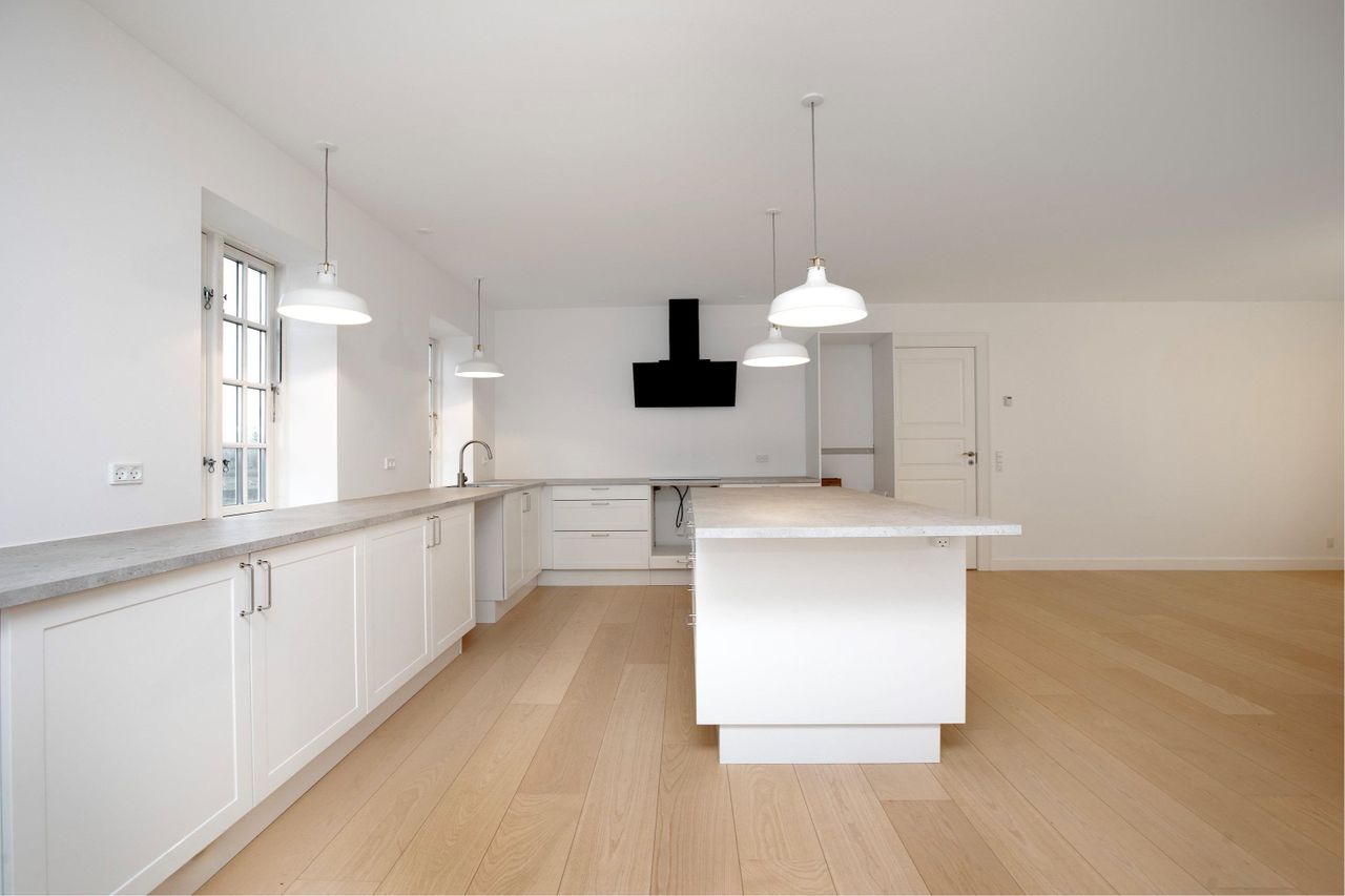 Det centrale rum i huset er et stort køkken / alrum / spisestue i husets fulde bredde, så der kommer lys ind fra begge sider. Her er sat et helt nyt lyst køkken ind, så alt er bare indbydende lækkert. Det samme gælder husets to badeværelser: Helt nye og pæne og i afdæmpede farver, så det hele spiller fint sammen med den klassiske bygning.