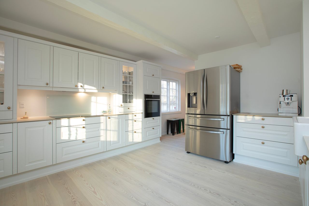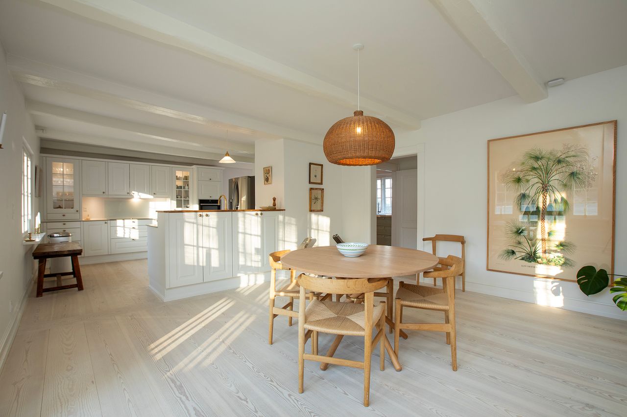 Husets høje kvalitet slår tydeligt igennem over det hele. Her er særdeles præsentabelt og samtidig hyggeligt, med dejlige lyse stuer en suite med Dinesen douglas planker i hele længder på gulvene. Masser af lysindfald og udsigt til naturen omkring ejendommen. Tilsammen giver det rummene masser af sjæl, varme og en fuldkommen indbydende atmosfære. Her er simpelthen rart at være og god energi. Et nyere hvidt landkøkken passer perfekt til stedet, og hænger sammen i helt åben forbindelse med en stor hyggelig spiseafdeling, hvorfra der også er udgang til terrassen og haven. I forlængelse heraf er der to hyggelige stuer.