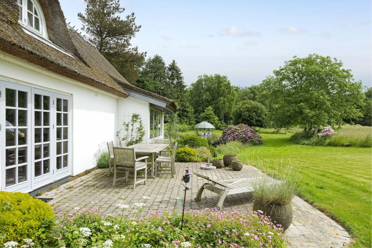 I stuehusets ene længde er der terrasser som vender syd/vest og er orienteret ud mod eng, sø og skov.