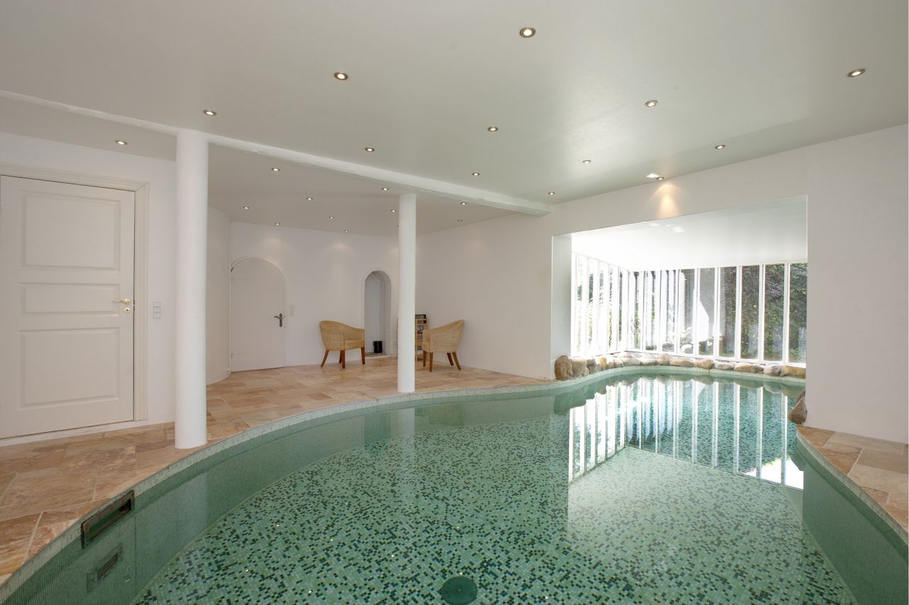 gode værelser, flere badeværelser samt indendørs pool, som kan opvarmes. Flere steder er der stuklofter, fritlagte