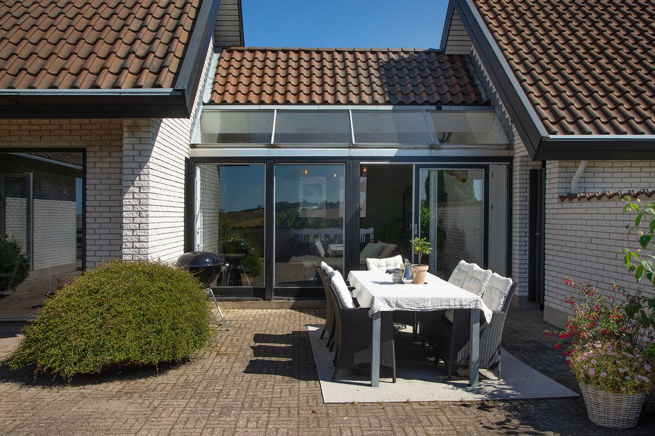 b: Huset er lige sat i stand, der er væltet vægge og det hele er helt nytænkt indvendig, så den fremtræder ualmindelig lækker, nutidig og indbydende - og med en virkelig god planløsning. Her er lyst dejligt køkken fra 2023-24, som hænger sammen med spisestuen, stuen og havestuen - og skaber et eksklusivt, hyggeligt åbent hjem med masser af lys, luft og plads. Flere udgange til både terrassen og til balkonen, som ligger ideelt for både sol og udsigt. Man er helt privat, for huset ligger højt.
