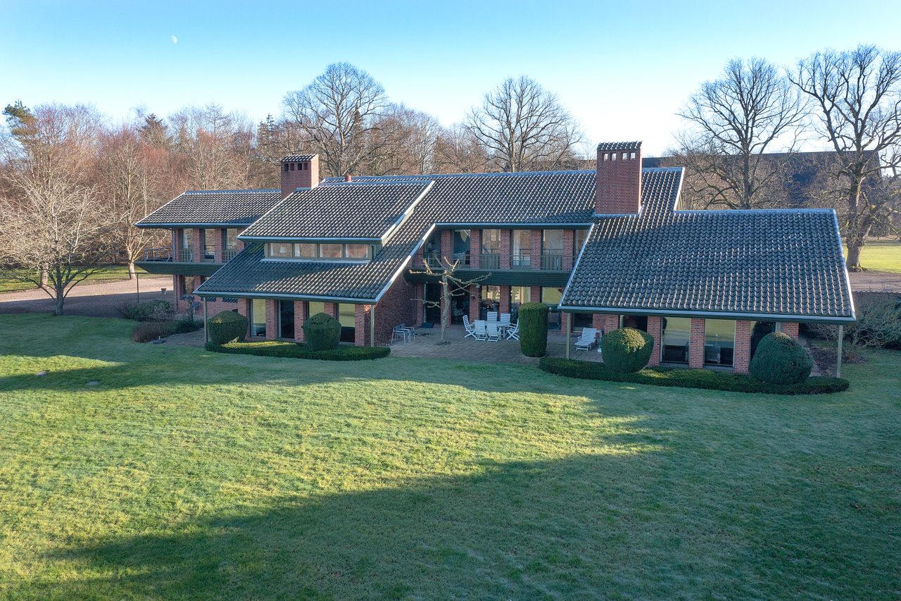 Man modtages i en stor præsentabel hall i to etagers højde, og herefter folder huset sig ud. Det rummer flere smukke stuer en suite - alle føles både hyggelige og samtidig eksklusive, og med udsigt over de storslåede omgivelser. Endvidere bibliotek, kontor, køkken, daglig spiseafdeling m.v.