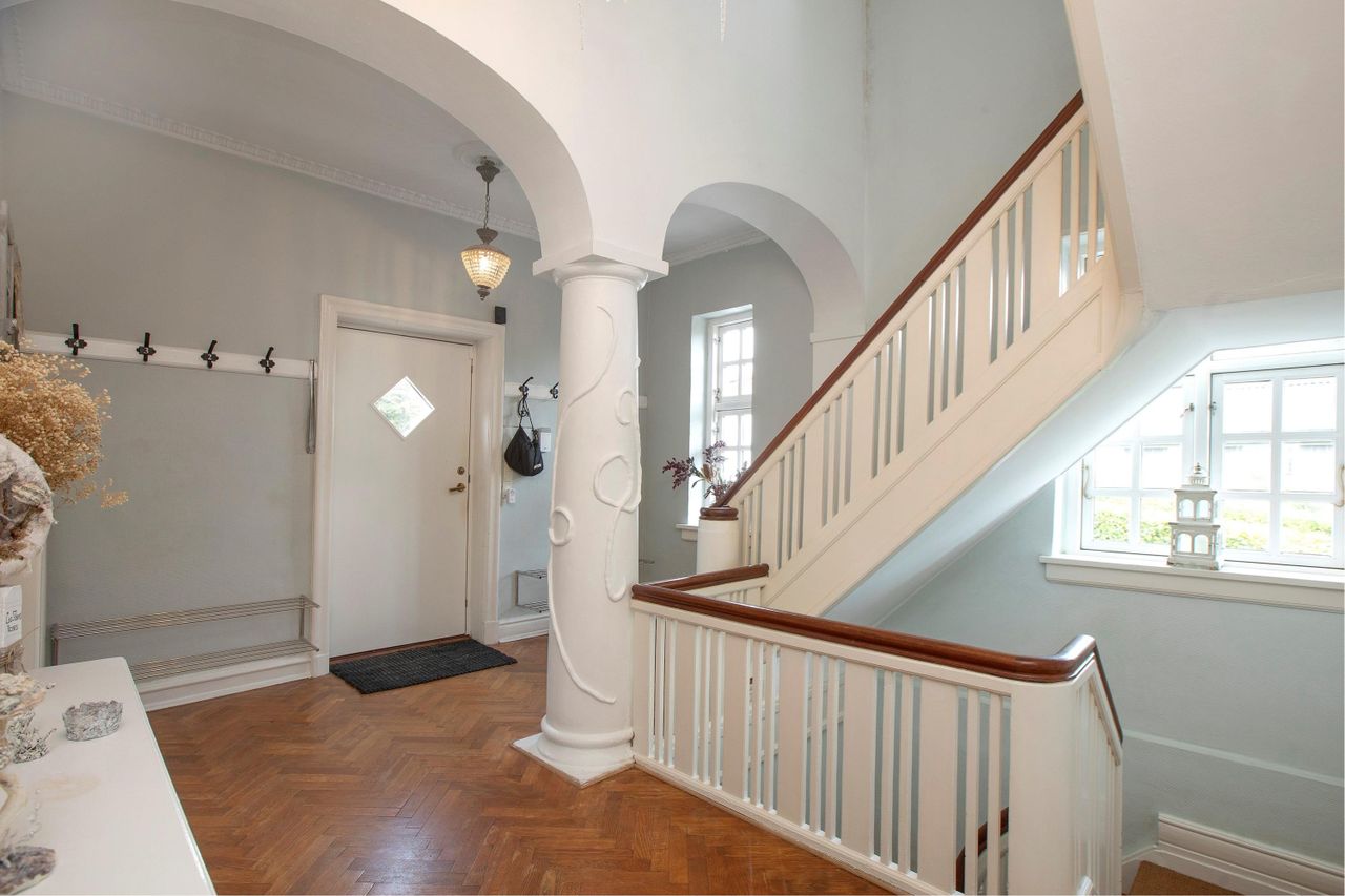 På 1. sal har master afdelingen adgang til stort udsigtsbadeværelse og udgang til stor balkon. Om muligt er udsigten endnu mere storslået her, hvor man ser helt til Sverige. Yderligere 4 gode værelser og et endnu større badeværelse med både hjørnekar og brus.